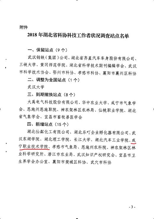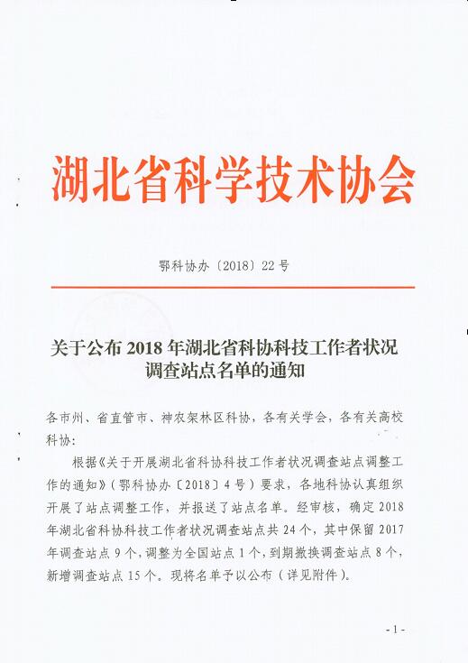 2018年3月26日,我校被湖北省科协技术协会批准为科技工作者状况调查站点。科技工作者状况调查站点是科协开展科技工作者状况调查的重要载体,是党和政府了解一线科技工作者状况的重要渠道,是为科技工作者提供优质高效服务的重要窗口。