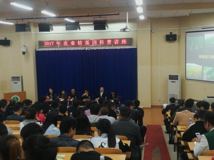 10月19日下午3:30,一场题为《转基因与我们的生活》的科普讲座在我校教1201隆重举办。主讲人为省农业厅农业科技人才办公室正高职高级农艺师胡继红。出席讲座的省市领导包括省农业科技人才办主任梅香生、副主任金国胜、市农业局副局长王慧华、市气象局副局长赵雅静。市农学会、气象学会、桂花工程技术中心、食用菌工程技术中心、芳香植物研究所、我校2017级“一村多名大学生计划”学员、17级生物工程学院全体学生以及科技处全体工作人员近300人聆听了讲座。讲座由副校长吴高岭主持。