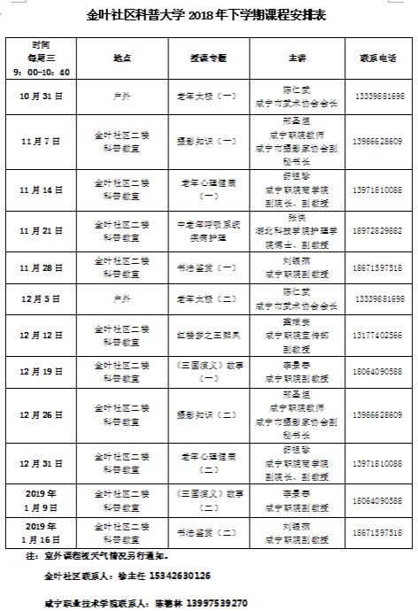 咸宁社区科普大学金叶社区榜样教学点2018年秋季班于10月31日在咸安区温泉街道办事处金叶社区开班。我校作为咸宁社区科普大学总校单位此次仍然负责科普大学教学管理工作。为提高授课的针对性和实用性,此次开课前曾广泛听取社区学员意见,并将意见整理成相关课程面向全校征集授课教师。本次授课教师还吸纳了校外人士的参与。形式多样、精彩纷呈的课程,以及我校教师深厚的理论学识和扎实的手工技艺再一次赢得社区学员的广泛好评。
